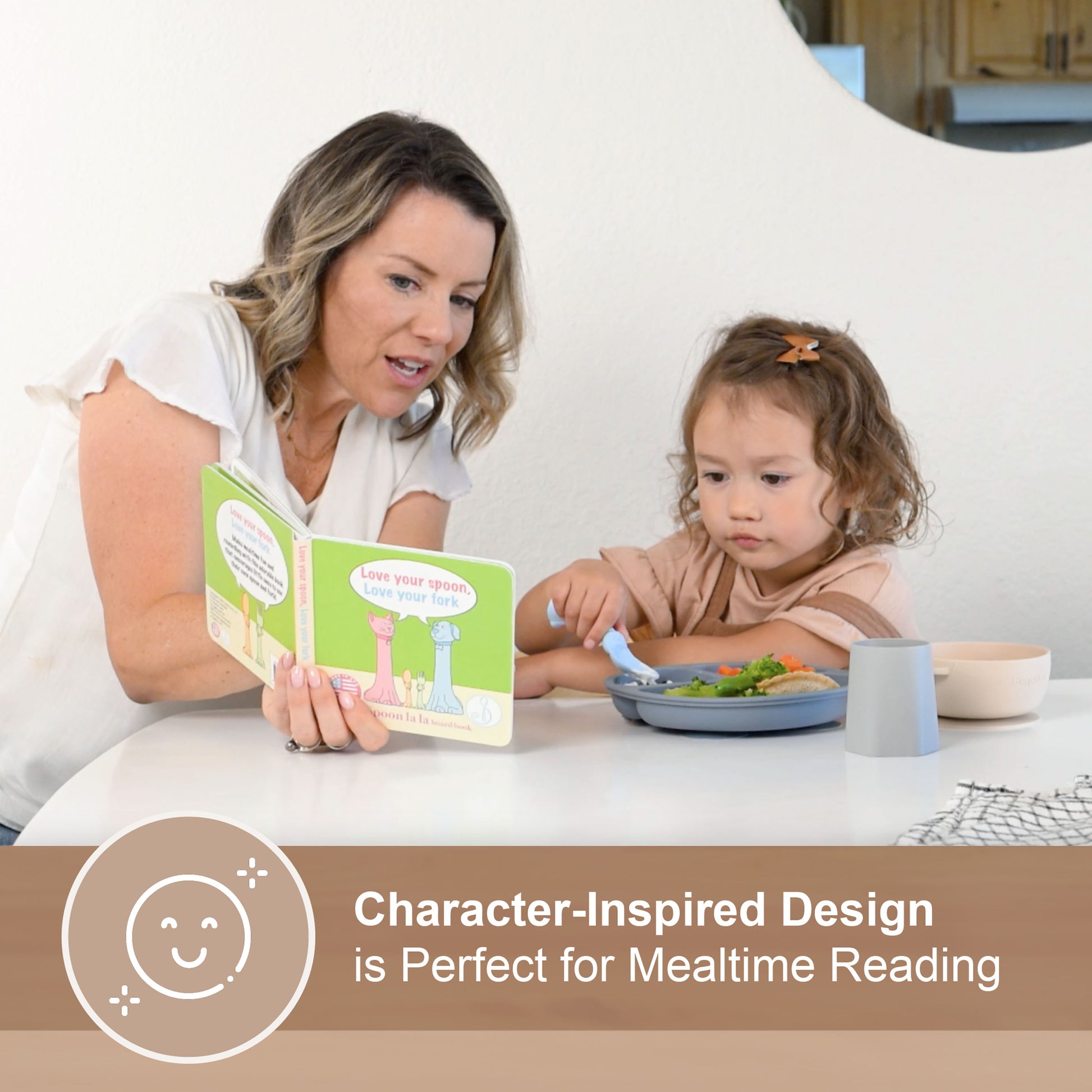 · LESS MESS: Our spoon and fork are dishwasher and microwave safe. They stand upright, keeping the silverware tops away from the surface. This means less mess for you to clean and more hygienic mealtime for little ones. Our durable board book can withstand any mealtime fun!