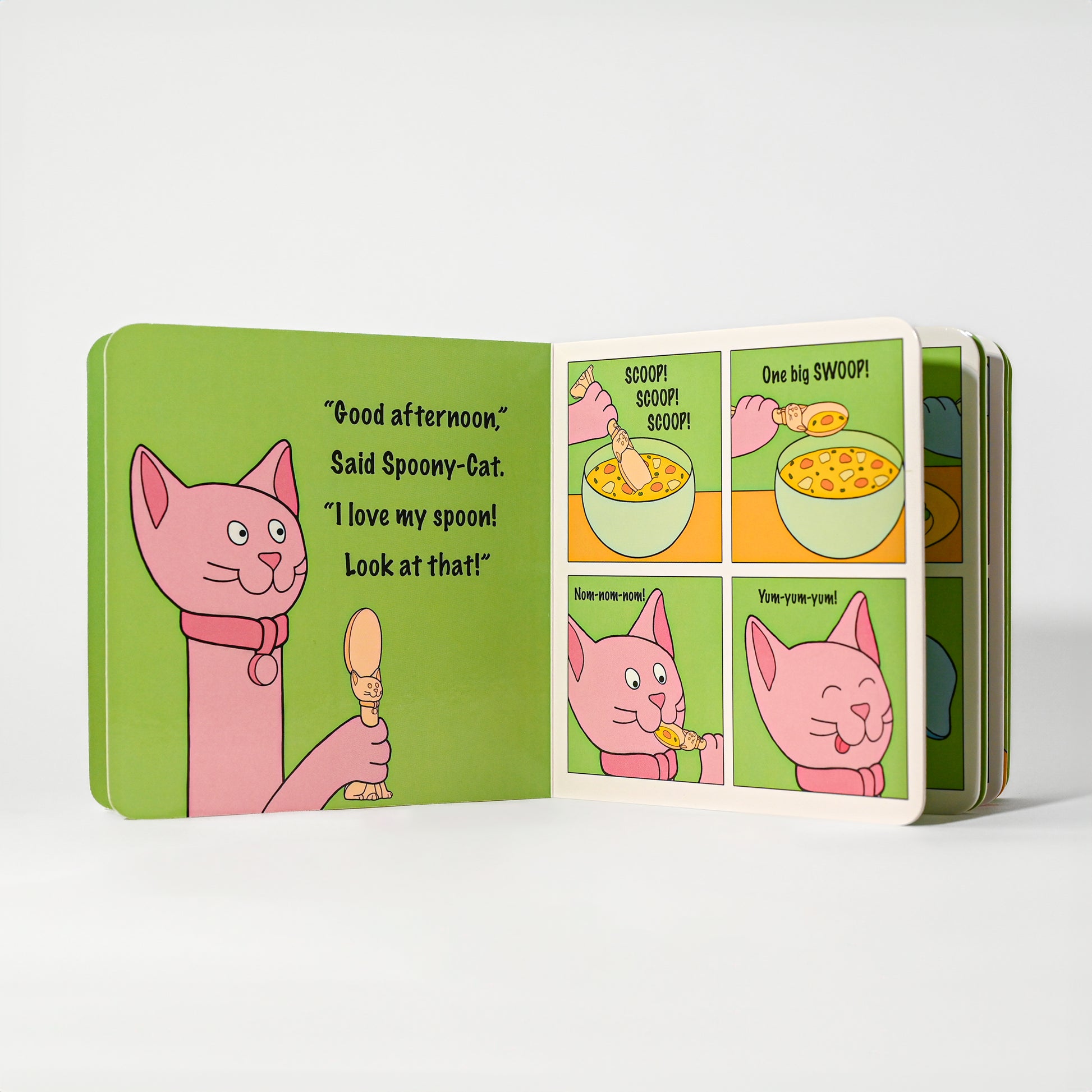 · LESS MESS: Our spoon and fork are dishwasher and microwave safe. They stand upright, keeping the silverware tops away from the surface. This means less mess for you to clean and more hygienic mealtime for little ones. Our durable board book can withstand any mealtime fun!